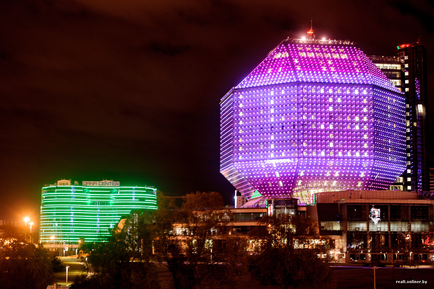 Прокатимся по проспекту Победителей, бывшая Парковая магистраль проспект Машерова. Здесь сосредоточены объекты яркой архитектурной подсветки, уносящие как будто в дали вселенной.