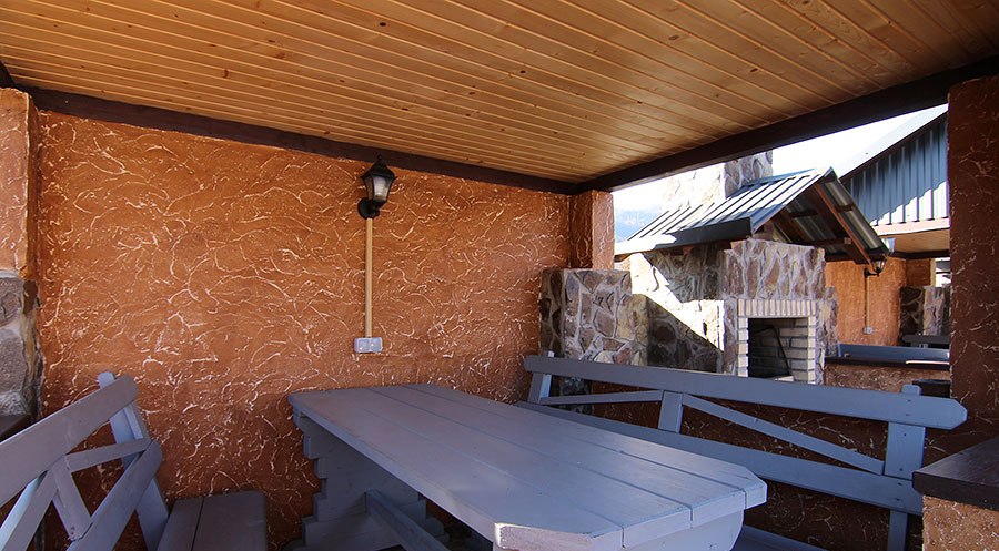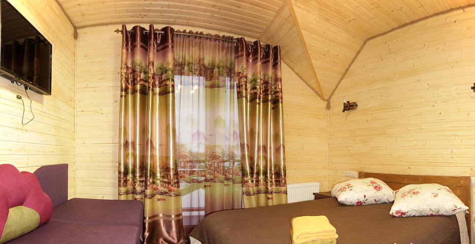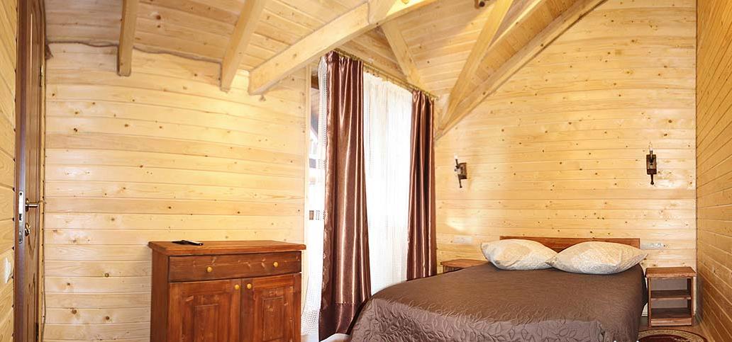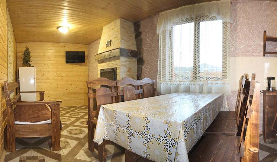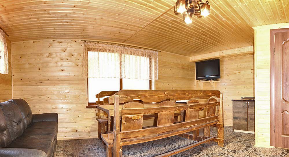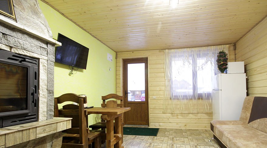 На первом этаже всех коттеджей есть большая гостиная с камином и мебелью для отдыха, мини-кухня (микроволновая печь, чайник, холодильник, посуда, мойка), обеденная зона.