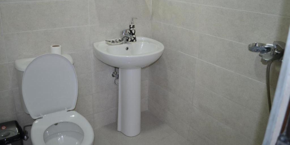 В собственных ванных комнатах: современная сантехника, набор полотенец, туалетно-косметические принадлежности и фен.